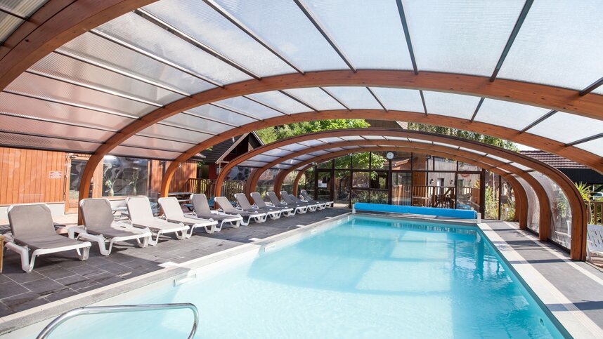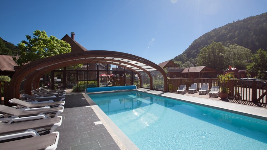 This attractive site is located in the Munster Valley, on the Alsatian side of the Vosges. The park has 30 attractive, wooden chalets in six different sizes and styles; the smaller models accommodate just two people, while the larger units sleep eight. There are no touring pitches here. There is plenty of shade from mature trees and views of the forest-covered mountain slopes on either side. The main building houses reception, a small bar and a smart restaurant with a comfortable and modern terrace overlooking an attractive, heated pool with retractable roof. The restaurant offers a good choice of food with a range of set menus and à la carte dishes.