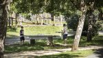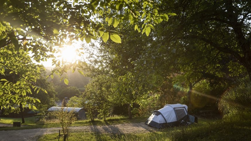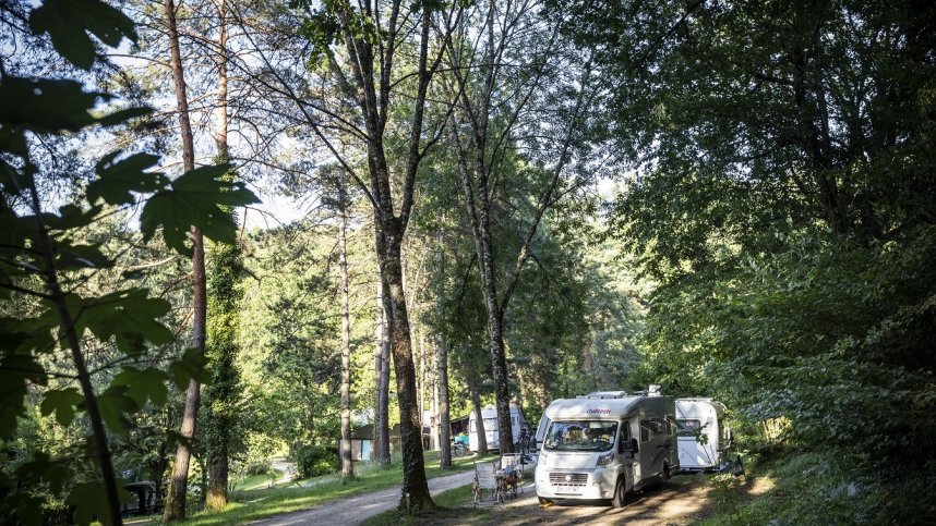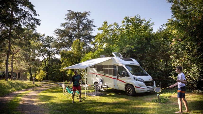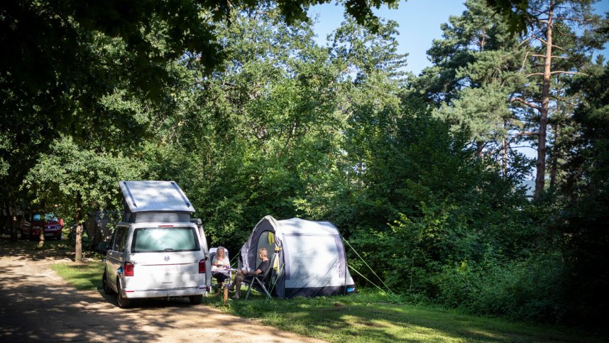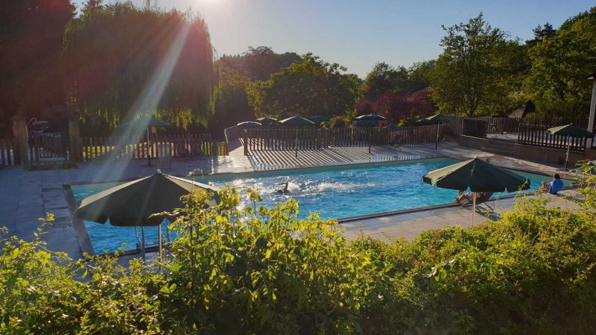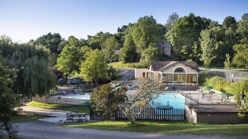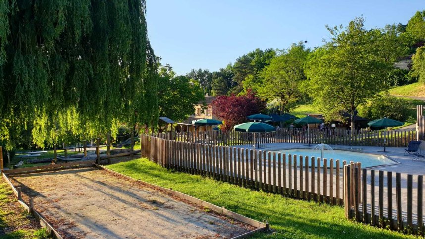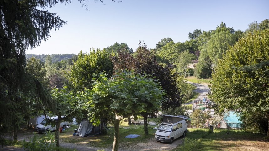 Huttopia Sarlat (Formerly Les Perières) is a pleasant small site set on an attractive, wooded, terraced hillside within walking distance of the beautiful medieval town of Sarlat. The 107 touring pitches (all with 6A electricity) are arranged around the semi-circle of a fairly steep slope, overlooking a central leisure area that includes indoor and outdoor swimming pools and a tennis court. They range from 80-100 sq.m. Mixed pine and deciduous trees provide dappled shade. Close to the central buildings are numerous walnut trees (the walnuts can be bought in the campsite shop).