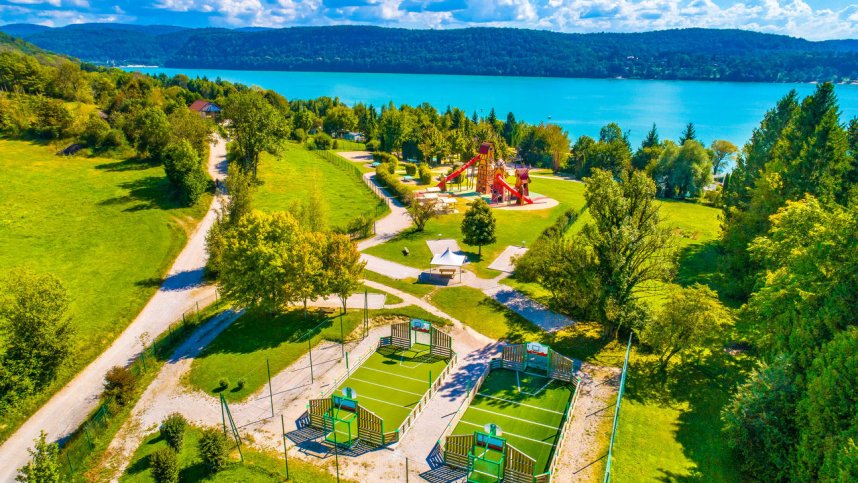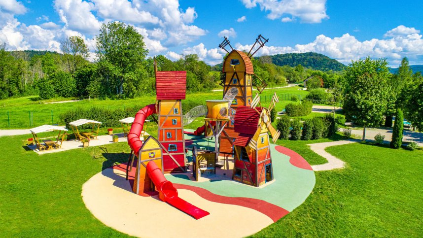 Three good quality and well appointed toilet blocks provide all the necessary accessible facilities and excellent provision for children. Washing machines and dryers. Motorhome services. Shop (14/6-6/9). Self-service restaurant (14/6-6/9). Bar, takeaway (8/5-6/9). Pool complex (8/5-6/9), indoor and outdoor pools heated. Good play areas and children’s clubs. Boules Lake swimming. Fishing. Bicycles, pedaloes, canoes and small boats for hire. Organised programme in high season, evening entertainment with disco twice weekly. Inflatable games, Multisports, Cinema, Mini-golf, Ping-Pong tables, Beach volleyball, Football ground, Pumptrack,Internet access and WiFi (charged). Chalets for rent.