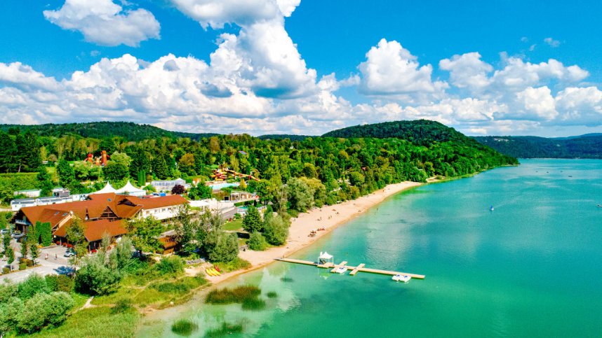Close to the Swiss border and overlooking the sparkling waters of Lac de Chalain, la Pergola is a good quality terraced site set amongst the rolling hills of the Jura. Neat and tidy, and very well maintained, it has 350 large pitches, 100 for touring, mainly on grass and gravel and separated by small hedges. Ten are serviced pitches. All have electricity (10/12A), water and drainage and some have shade from a variety of mature trees. The remainder are occupied by chalets. The attractive bar/restaurant and terrace are next to the pool complex and entertainment area, with views over the lake. This is a good holiday base for families with young children. English is spoken.