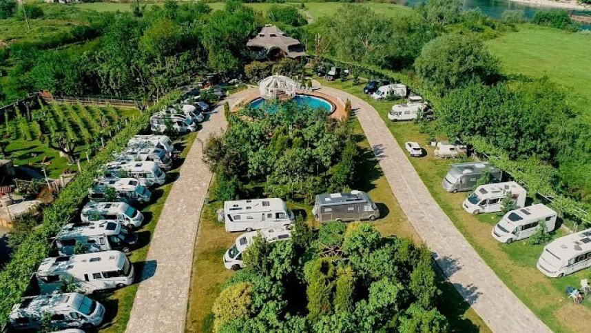The campsite is equipped with a comprehensive range of facilities and includes the central circular swimming pool, complete with a circular gazebo lounge, offering the prefect place to cool down during the warmer months. Younger visitors can enjoy the on-site playground, while a volleyball court provides opportunities for recreation. Modern conveniences are also well-catered for, with Wi-Fi access available across a significant portion of the site. The sanitary facilities are consistently clean and well-maintained. For those who enjoy cooking there is a designated BBQ area as well as a communal kitchen. A highlight of Camping Legjenda is its highly-regarded on-site restaurant which is set within a picturesque garden adorned with art installations that narrate the legend of Rozafa Castle, the restaurant serves a menu of traditional Albanian cuisine and Mediterranean dishes.