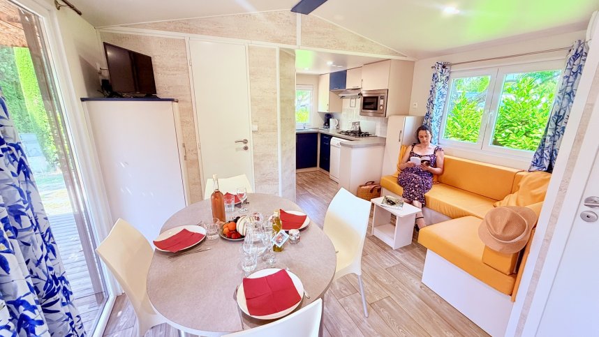 Six very modern, unisex toilet blocks were immaculate when we visited. All are heated in low season and have some washbasins in cabins. Family rooms and en-suite accessible facilities in two blocks. Washing machines and dryers. Two motorhome service points. Recently refurbished shop with good range of essentials and regional produce. Bar with snacks (July/Aug). Swimming pool. Library. Play area. Boules. WiFi over site (free in library). Gas and electric barbecues only. Bicycle hire. Mobile homes and chalets for hire.