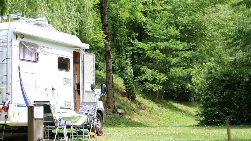 This is a small, peaceful and rustic site run by an enthusiastic French family, situated in a secluded wooded valley between the Cantal and the River Lot. The wide variety of trees and shrubs offer varying amounts of shade and privacy. The 50 grassy, slightly sloping, terraced pitches (39 for touring) are naturally set out on the hillside.