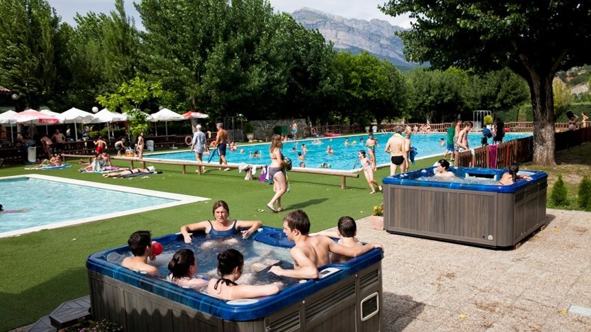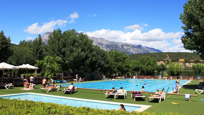 A large site situated in the Pyrenees near the Ordesa National Park, Peña Montañesa is easily accessible from Ainsa or from France via the Bielsa Tunnel (steep sections on the French side). The site is essentially divided into three sections opening progressively throughout the season and all have shade. The 330 pitches on fairly level grass are of about 75 sq.m. and 6/10A electricity is available on virtually all (no charge is made for upgrade). Grouped near the entrance are the facilities that make the site so attractive, including an outdoor pool and a heated (out of season), glass covered indoor pool with jacuzzi and sauna. Here too is an attractive bar/restaurant with an open fire and a terrace; a supermarket and takeaway are opposite.