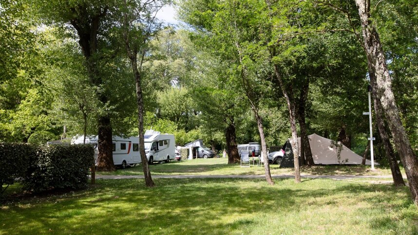 This site on the bank of the Ardèche, Camping la Roubine must be considered one of the best sites in the area. There are 97 touring pitches, all with electricity (10A) and quite spacious. Well tended grass, trimmed hedging and mature trees and smart tarmac roads create a calm and well kept atmosphere. The proprietors, M. Moulin and Mme. Van Eck like to welcome their guests and are available to help during the day – they are rightly proud of their well run campsite.