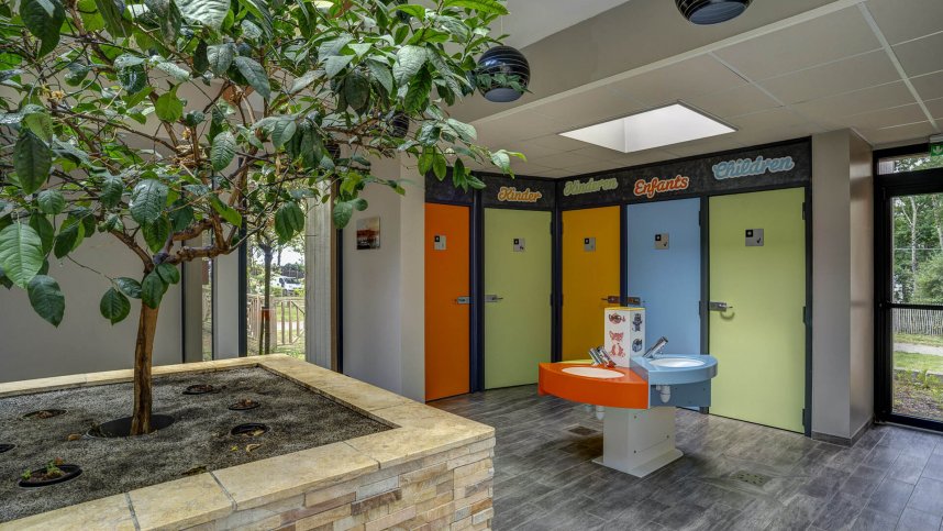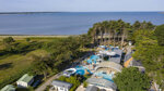 Three bright, modern, heated toilet blocks include some washbasins in cabins and large preset showers with dividers. A new block has family cabins and facilities for children. Good accessible facilities. Laundry facilities. A small shop sells fresh bread (Seasonal). Butcher’s van calls in high season. Bar with snacks and takeaway (July/Aug). Covered solar-heated pool and paddling pool. Spa with sauna and jacuzzi, Play area. Entertainment, Kids club, Water sports. Free WiFi over part of the site.