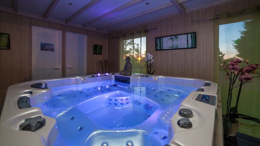 Two heated toilet blocks (effectively unisex, one open in high season only) have some washbasins in cubicles, controllable showers, an en-suite accessible unit and a baby room. Washing machines and dryers. Minimart, bar, takeaway and restaurant (13/4-8/9). Heated outdoor pool (1/5-1/9). Heated indoor pool and children’s pool (all season). Wellness centre with sauna, hot tub, Shiatsu massage and beauty treatments. Fitness and jacuzzi rooms. Beach on lake. Games area. Canoeing and fishing. Tennis. Minigolf. Volleyball. Pétanque. Play area with trampoline. Kids’ club, sports tournaments, excursions and activities, aquagym, archery (July/Aug). Bicycle hire. Chalets/mobile homes for hire. WiFi (free in bar).