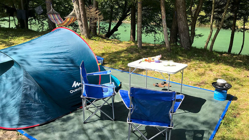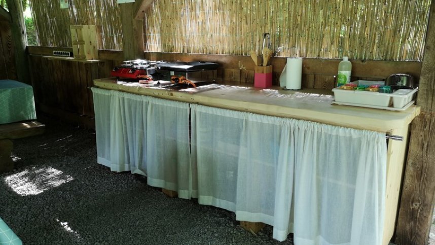 Wooden structure with solar-powered showers and lavatories that include ecological and natural soaps for general usage. Additional wooden construction with regular toilets. Vintage caravan transformed into a bar serving morning coffee on the river bank or offering evening refreshments by the bonfire. Daily fresh bread delivery. Shared kitchen with stoves and barbeques providing all necessary equipment and a sink. A natural spring for drinking water. Boardgames. Mini library. Volleyball court. Badminton and other outdoor sports equipment (balls, frisbees, racquets etc.). Bike and eBike rental. Organized activities such as climbing, rafting, zipline-ing, kayaking, fishing and horse riding. Direct access to the river beach. Use of hammocks in the shade by the river.