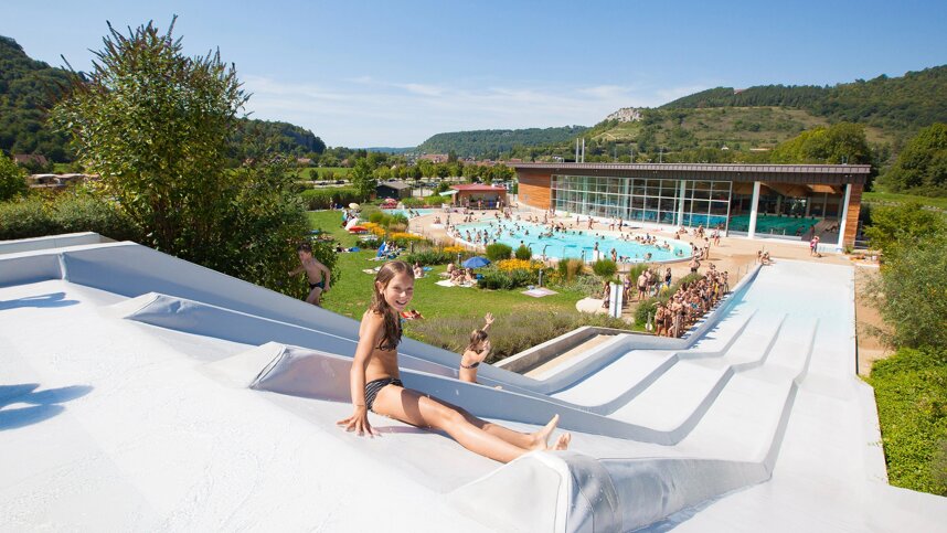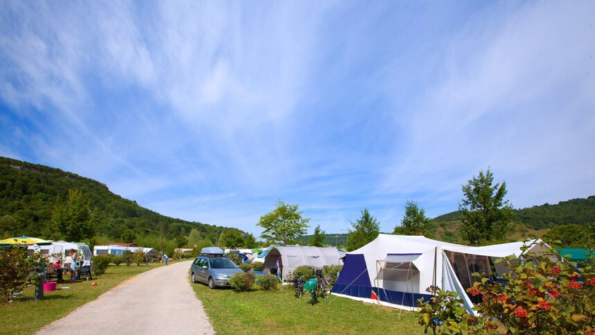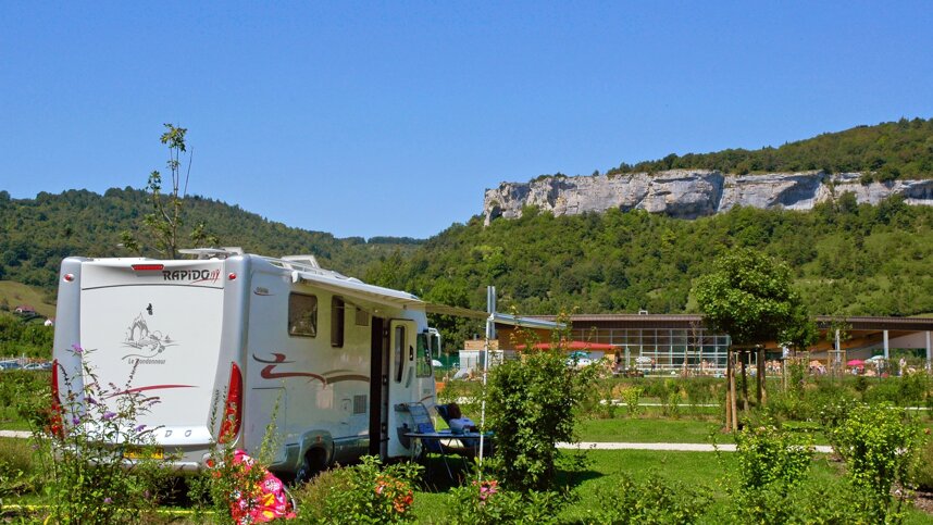 Situated in the heart of the Jura mountains and close to historic Ornan, La Roche d’Ully is a spacious, attractive and modern site, surrounded by views of wooded hills and rocky outcrops. There are 115 large pitches, 75 of which are for tourers, most have electricity (10A) and all have access to water. Divided by a variety of bushes and young trees, there is not a great deal of shade.