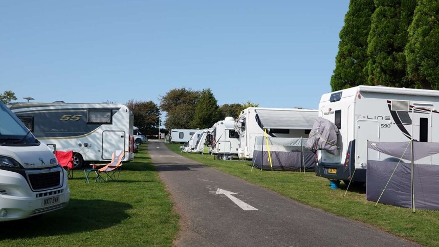 Two modern well equipped and maintained sanitary blocks which include accessible sanitary facilities. Dishwashing areas, well equipped laundry. Motorhome service point. Security barrier. Outdoor heated swimming pool. open end May to mid Sept (weather permitting). Tennis court. Crazy golf. Chemical toilet point. Gas sales. Children’s play area and ball area. Wi-Fi poor, charged. Shop stocking calor gas and food basics. BBQs allowed gas, electric & charcoal. Defibrillator. TV reception good. Pets allowed. Dog walk. Visiting Fish & Chip vans in season. Late night arrivals area with hook-up. Twin axle caravans accepted. No tents allowed. Bus stop adjacent. Train station 2 miles. Morrisons 7 miles. Earliest time of arrival 1:00pm. Maximum outfit length 10 metres.