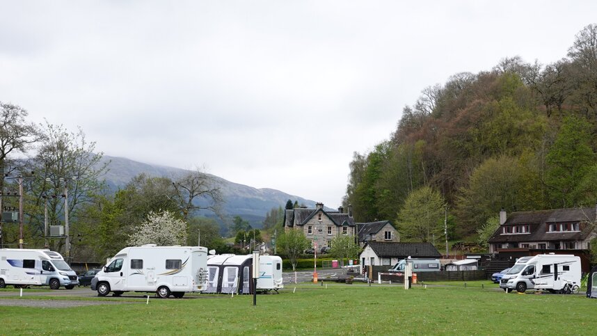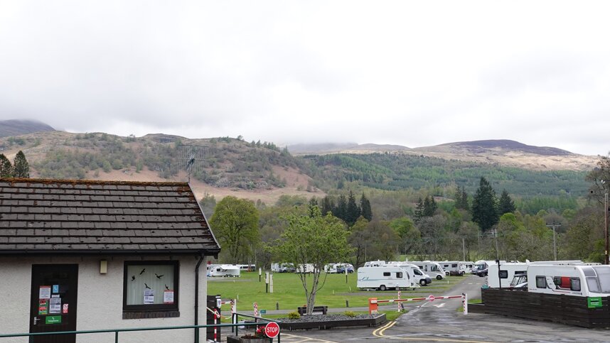 The site is on the right of the A827 (Killin - Kenmore) 0.5 miles past the end of the village. Please note: the site is on the main road. Do not turn into Pier Road which is unsuitable for caravans or motorhomes.