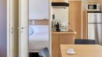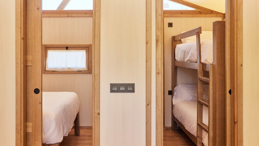 A double room with a double bed, and a living room with a sofa bed for two people.