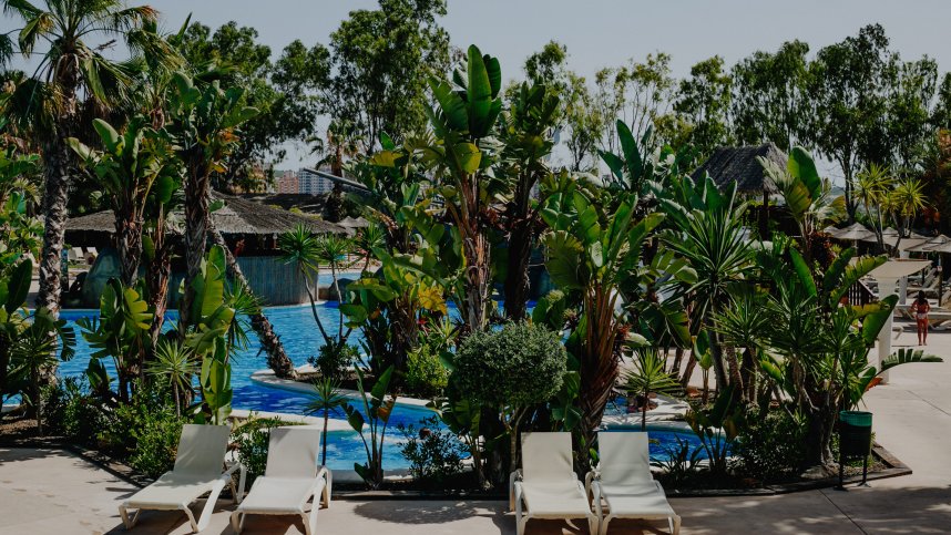 There is some shade, and the site has an open feel with lots of room for manoeuvring. Reception is housed within a delicately coloured building complete with a towering Mirador, topped by a weather vane depicting the ‘Garza real’ (heron) bird, which frequents the local area and forms part of the site logo. The large restaurant overlooks the pools and the river that leads to the sea in the near distance. The bar has large terraces fringed by trees, palms and pomegranates. The impressive pool/lagoon complex (1,100 sq.m) has a water cascade, an island bar, plus a bridge; one part is sectioned as a pool for children and a jacuzzi. The extensive sports area is also impressive. No effort has been spared here, and facilities are of the highest quality. A professional team provides a comprehensive entertainment programme for adults and children in the high season.