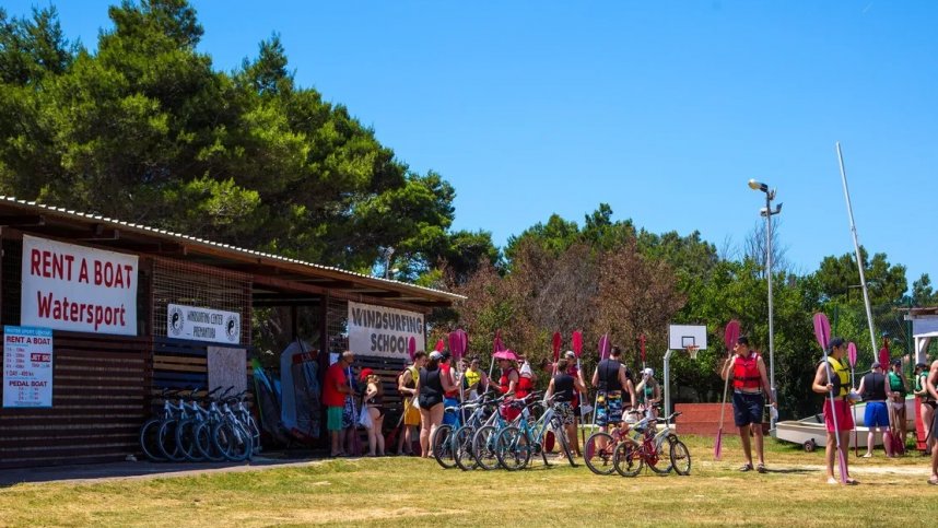The six toilet blocks, although old, are immaculately clean. Toilets are a mixture of styles. Showers and free hot water. Washing machines. Good supermarket. Kiosk and several good small bars and grills. Minigolf. Modern playground. Multi-sports field, Tennis court(s), Beach volleyball, Stand-up Paddleboards, Kayak. Activities for children. Some live entertainment at the restaurant in high season. Rock and pebble beach. Marina, boat launching, jetty and scuba diving. Bicycle and beach buggy hire. Aquapark. Free WiFi over 80% of the site.