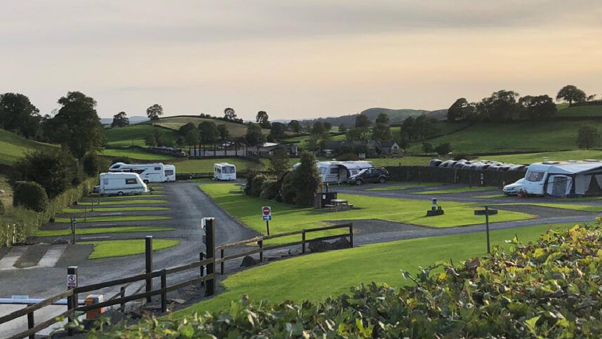 The Ashes is a small, friendly, adults only park in an extremely peaceful setting in the rolling Cumbrian countryside, yet less than three miles from the M6, and only slightly further from Kendal. Thus it is not only a convenient night stop, but also a useful base from which to explore the Lake District and the Yorkshire Dales. A very tidy park, the central grass area is attractively planted with shrubs and bushes and there is an open vista (with little shade). There are 25 hardstanding gravel pitches, all with 10A electrical connections. These are neatly placed around the perimeter with an oval access road. The whole area slopes gently down from the entrance, with some pitches fairly level and others with a little more slope (levelling system for caravans on all pitches). No tents are accepted other than trailer tents.