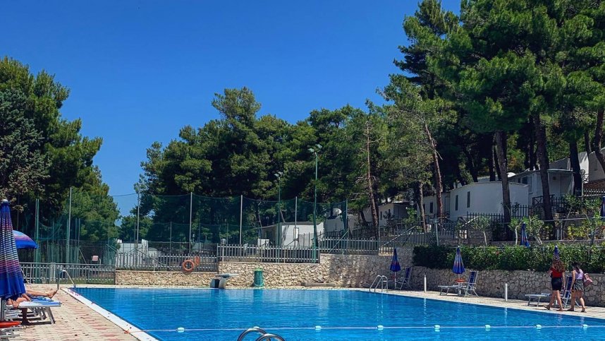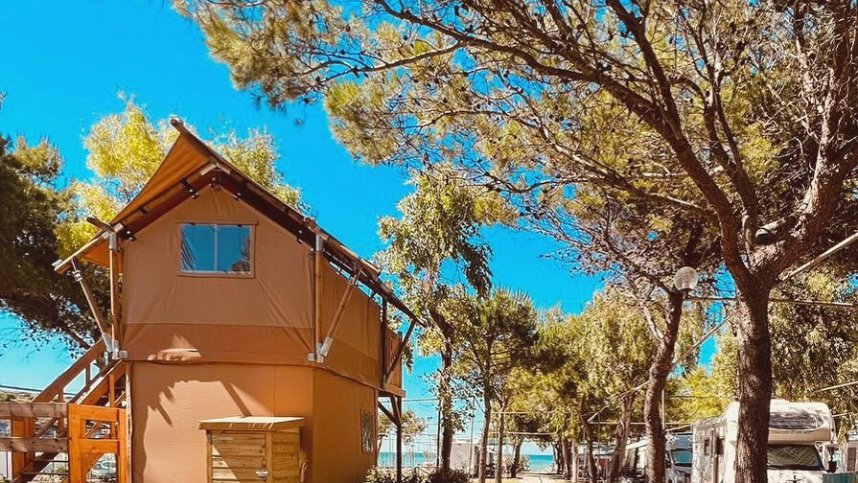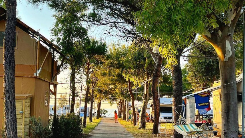 Just for the view, you should take a dip in the campsite's swimming pool as it looks out over the Adriatic Sea, the beach and the surrounding mountains. A little train running across the site will take you to the beach. Around the central area of the site, you will find several shops, a supermarket, a greengrocer, a hairdresser and first aid. The campsite restaurant’s pavement café is also situated here. There are also plenty of sporting activities here, with tennis courts and beach volleyball, and you can also hire a kayak at the beach. The professional entertainment team runs during the summer months and there are various activities for every age group and an amphitheatre where live shows and performances are held. The mini club will also keep the younger members occupied throughout your stay.