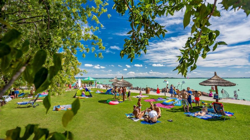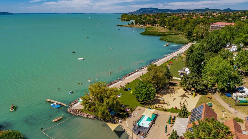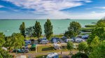 Camping Napfény, an exceptionally good site, is designed for families with children of all ages looking for an active holiday, and has a 200 m. frontage on Lake Balaton. The site’s 370 pitches vary in size (60-110 sq.m) and almost all have shade – very welcome during the hot Hungarian summers – and 6-10A electricity. As with most of the sites on Lake Balaton, a train line runs just outside the site boundary. There are steps to get into the lake and canoes, boats and pedaloes for hire. An extensive entertainment programme is designed for all ages and there are several bars and restaurants of various styles.