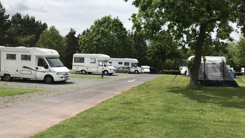 Brecon Beacons Caravan and Motorhome Club site is in a picturesque setting with with a few pitches having super views towards the Brecon Beacons. Originally farmland near the Brecon bypass, there are now three level, hedged and neatly mown areas with tarmac roads bounded by a mixture of hardwood trees and shrubs. These fields provide for 145 touring units of all types with hardstanding on 106 pitches with electricity points (10/16 amp) and 54 multi-serviced pitches with gravel hardstanding, and also 5 tent pitches. In a sloping field leading down to a stream is an extensive dog walk on one side of the Brynich Brook, on the other bank is an adventure play area. The stream is shallow and an added attraction along with the play equipment plus there is a large recreation field for ball games. The site also provides a caravan/motorhome storage compound.