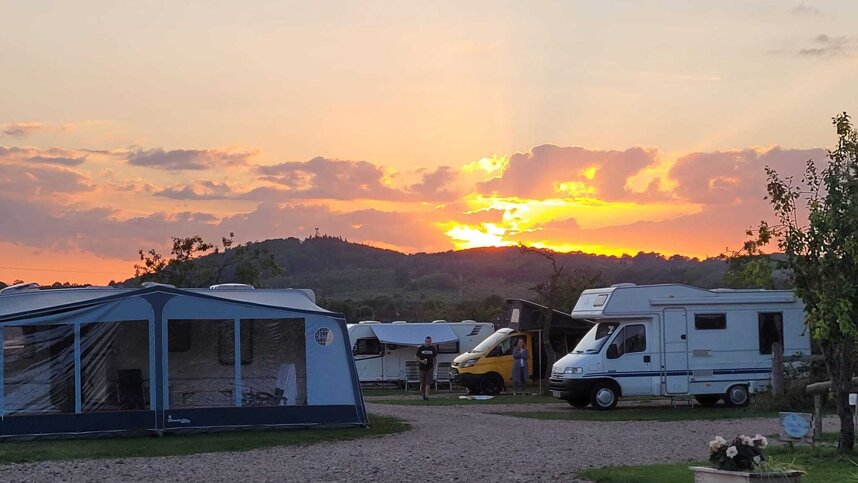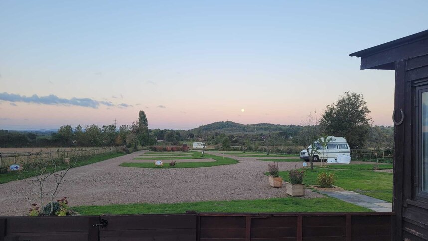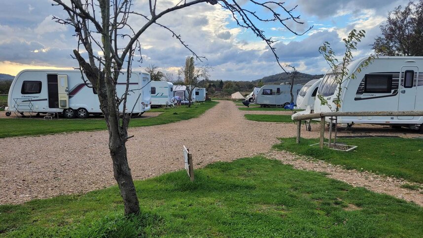 Bredon-Vale Caravan and Camping site overlooks Bredon Hill and the Malverns in the heart of historic Worcestershire's Vale of Evesham. Set in an orchard of over 100 fruit trees, this is a green site with a passion for the environment. It is only a short distance from the Cotswolds and Stratford Upon Avon, the home of Shakespeare. Sunsets here are truly magical. If you are an outdoor lover who enjoys growing and trying local produce, this is the place for you. This tranquil site provides visitors with a wonderful experience while supporting the local community. The Valley Country Park just a 15-minute walk from the site with 22 shops, a ride on train, play area, walks, fishing, cafes and restaurants. Evesham is a 40 min walk, the Farm Shop is a 25 min walk and the Blossom Trail for anyone wanting to cycle and see the blossom. The site has 25 grass or hardstanding touring pitches of which 11 have an electric hook-up point. There are also Log pods, Vintage Caravan and a Bell Tent are available to hire.