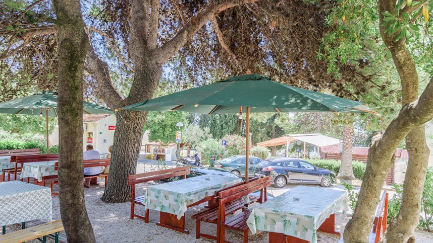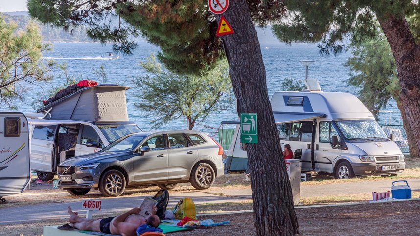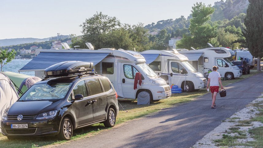 Camp Seget is a pleasant site from where there are superb views over the water to the islands. The site has 120 touring pitches, all with 16A electricity (long leads may be necessary), on land that slopes down towards to the water. They are on grass with some terracing and enjoy shade from a mixture of palm, olive and pine trees. To the front of the site, a paved promenade gives access to the pebble beach and from there it is an easy five minute stroll to an interesting waterside village with restaurants and bars serving high quality, good value meals. The site is an ideal base for exploring this part of the Dalmatian Coast, or for visiting Trogir and Split.