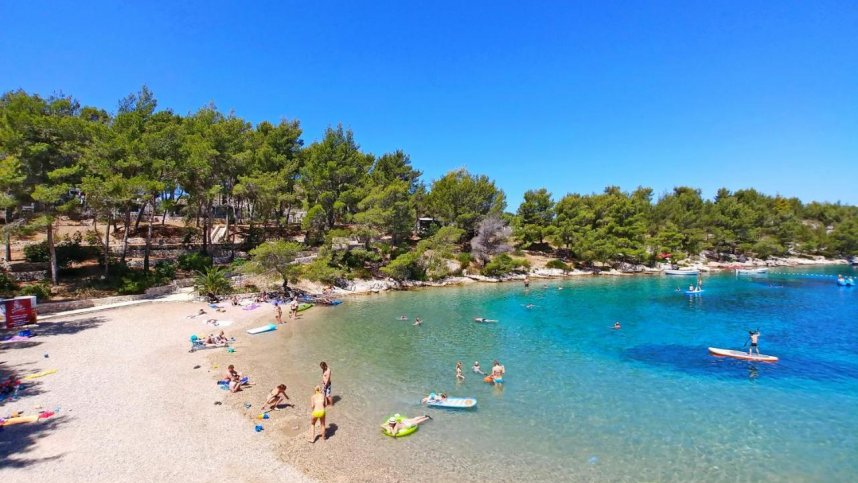 Situated at the western end of Hvar, Croatia’s longest and reputedly sunniest island, Camp Vira is a quiet site built around a small protected bay with crystal clear water and a 200 m. long, curved, pebble beach - an ideal place for sunbathing and swimming. Bordering the beach are an open plan bar and a restaurant. Most of the 172 pitches, all with 16A electricity, surround the bay and are set on steep terracing under ample pine tree shade. With extensive use of natural stone walling and good plant and tree cover, the site fits in very well on an island renowned for its unspoilt beauty.