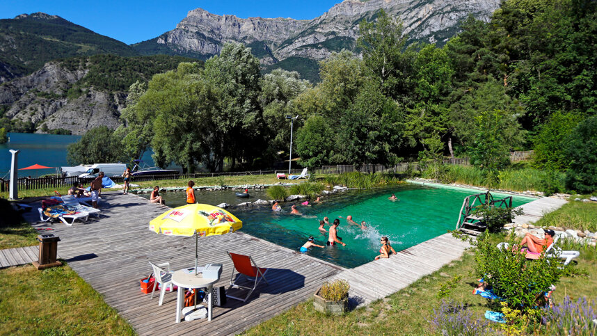 Le Lac is a member of the Campéole group and enjoys a fine location in the mountains of Haute-Provence. The site can be found at an altitude of 800 m. on the banks of the large Lac de Serre Ponçon and many of the site’s 300 pitches (192 for touring units) have fine views of the lake and the surrounding mountains. All are of a good size with electricity hook-ups (long leads may be needed) and ample water points. The access road down to the site (3 km) is fairly steep and winding but it is certainly worth the effort. The waters of the lake have an alluring blue-green hue and shelve gradually from the site’s beach. There is also an ecological swimming pool, using natural water, consistent with this stunning natural setting.