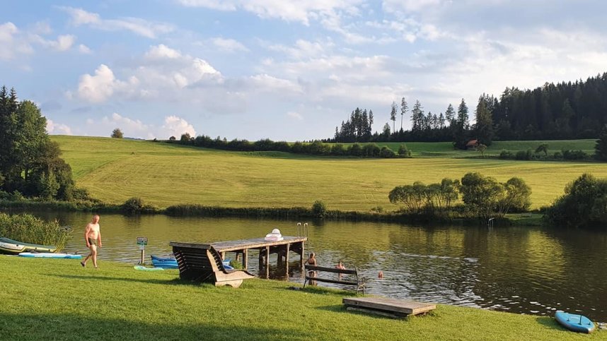From the reception, you can order bread, milk, eggs and basic provisions. A small café/snack bar with a terrace which overlooks the lake serves regional dishes made with local produce. The lake can be used for swimming, fishing, canoeing, and paddle boats.