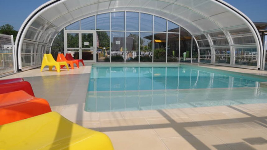 The sanitary block is fully equipped with sensor-controlled showers (one on each ‘side’ with en-suite washbasin), washbasins in cubicles and hairdryers. En-suite accessible facilities for visitors (with controllable showers). Baby bath on ladies’ side. Laundry room. Fresh croissants, pain au chocolat & bread delivered daily (must be ordered the day before.) Bar serving snacks and takeaways. Covered heated swimming and paddling pools, which are accessible. Play area (2-4 yrs.) Swings. Trampoline. Boules. Fishing. Note: all facilities, including reception, bar, swimming pool and both toilet blocks, are on an upper level, with ramps or steps leading down to the pitches on the lower level. Chalets to rent.