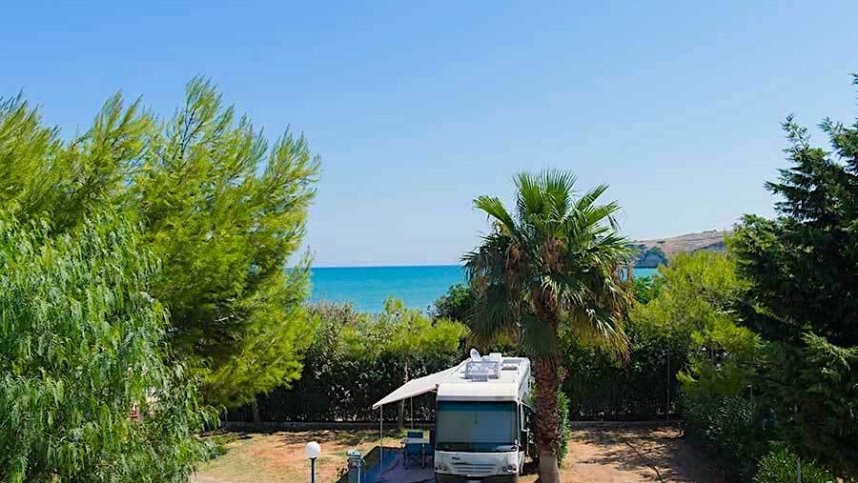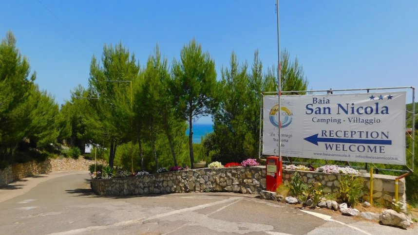 The Baia San Nicola Campsite and Holiday Village is situated in a picturesque cove just 2 kilometres from Peschici. This stunning location boasts 600 meters of pristine, golden sand, often considered one of the most beautiful beaches in the Gargano region. Upon arriving at Camping Baia San Nicola, proceed a short distance beyond the entrance to reach the reception area. Located approximately 100 meters to your left, near the bar, you'll be greeted by the friendly Mastromatteo family. The campsite has 100 touring pitches with 5Amp electric hook-up points available. The campsite is shaded by towering Mediterranean pine trees, giving plenty of shade during the summer months.
