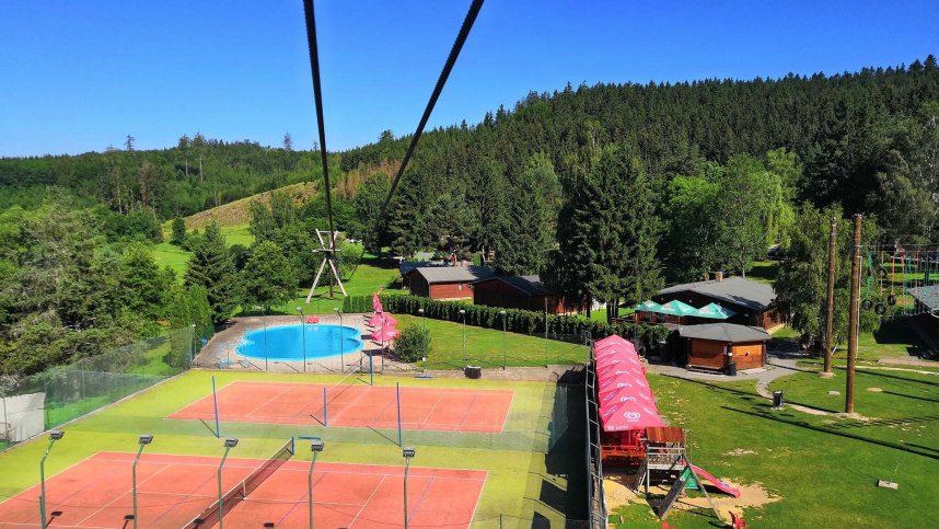 The site offers a restaurant with an outdoor terrace, offering a wide range of food, and evening entertainment is held here during the high season. There is also a wellness centre with artificial salt caves, a water world and a massage room. A wide range of sporting activities is available on site, including a ropes course and a 23-meter climbing tower, Archery, Paintballing, and Multisport courts where team games can be held. Escape rooms are also available to hire, and marked cycling and hiking trails direct from the site.