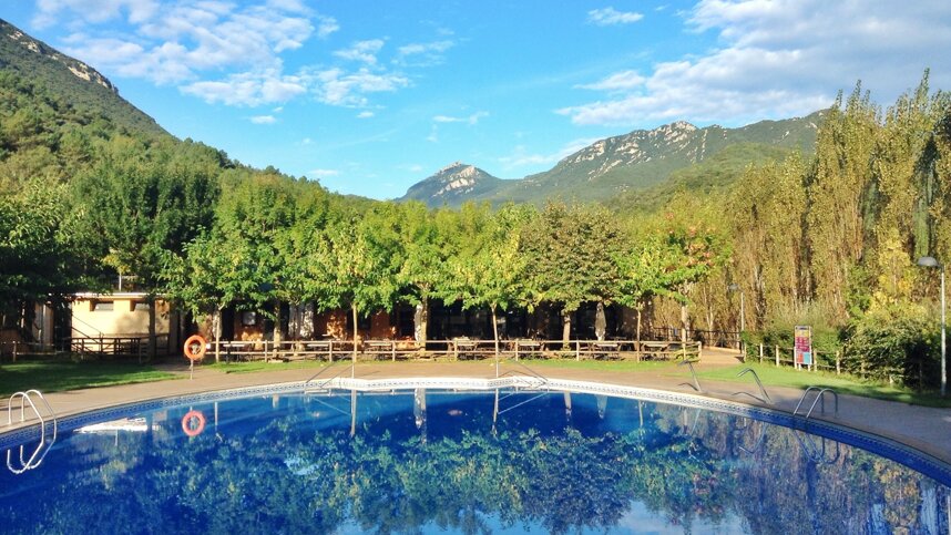 Surrounded by mountains alongside the Muga river, Bassegoda Park is a place to experience Spain in a natural environment but with a touch of luxury. This totally rebuilt site is just beyond Albanyà on the edge of the Alta Garrotxa National Park in an area of great beauty. In their own area, the 58 touring pitches are level and shaded, all on hardstanding and with access to electricity, water and drainage. Tents are dotted informally in the terraced forest areas. Particular care has been taken in the landscaping, layout and design of the attractive pool, bar and restaurant, the hub of the site. Regional wines and dishes are available in the reasonably priced restaurant.