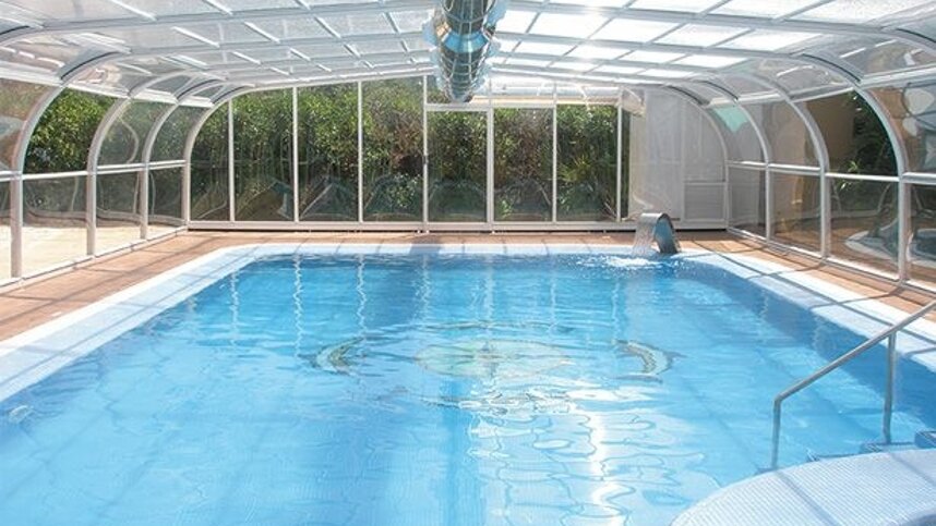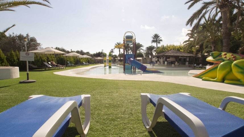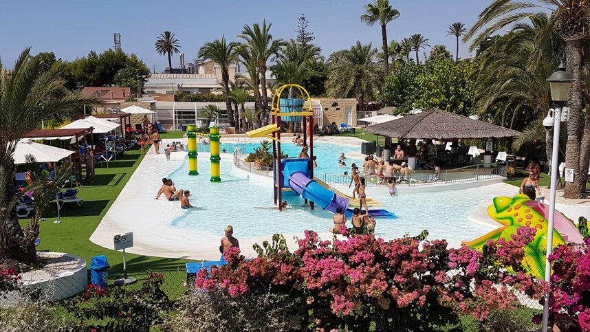 Amenities include the good sized, pleasant swimming pool which is open until late (22.00 in summer) and a lovely indoor pool. There are tall palms, a tropical ambience, cascades and small water slides. The pool has a good sunbathing area.