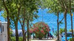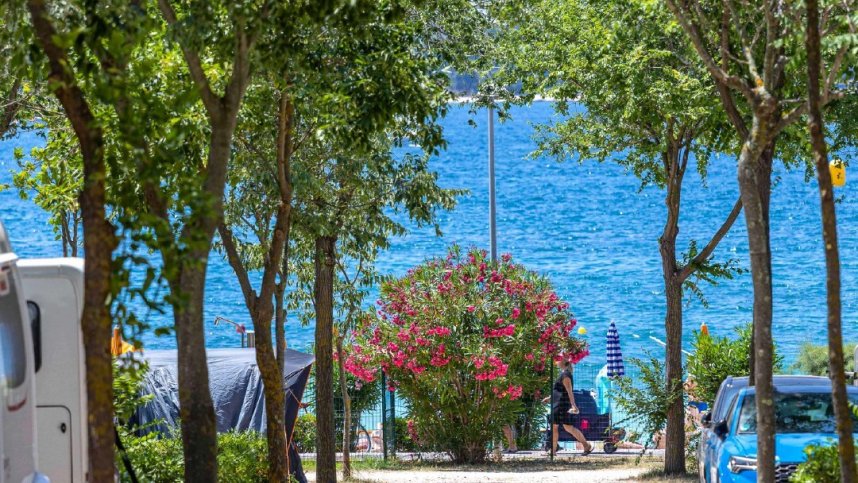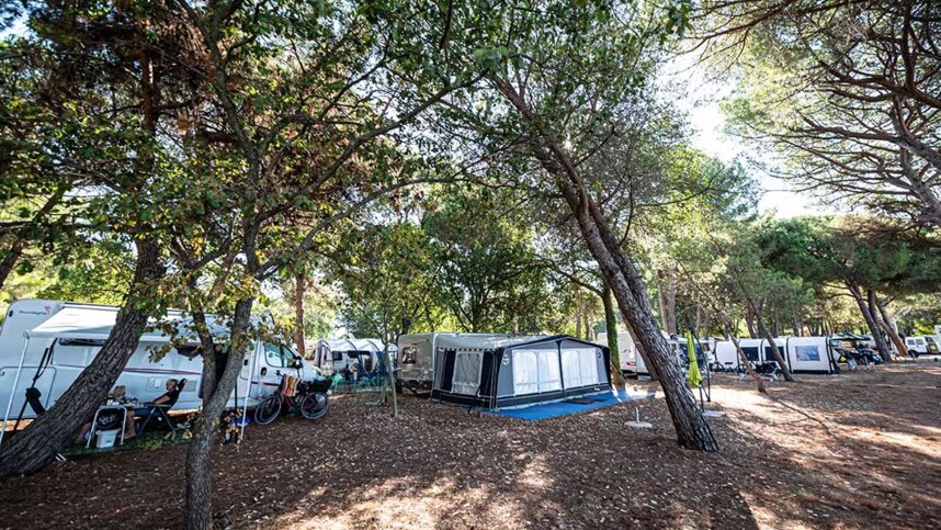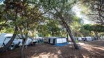 The campsite is separated from the holiday bungalows by the main site road, which runs from the entrance to the beach. Pitches are set in long rows accessed by gravel lanes, slightly sloping towards the sea, with only the bottom rows having shade from mature trees and good views over the Adriatic.