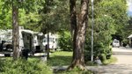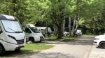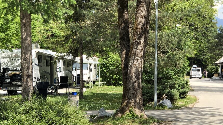 Camping Bled is situated on the western tip of Lake Bled and is an excellent example of how a site should be run. Check-in is quick and efficient, and English is spoken. The site is large but well-spaced, with 244 touring pitches, all with electricity, 40 fully serviced pitches, and six with private sanitary facilities; most pitches benefit from shade. Pitches at the front are used mainly for overnighters. There are lovely views across the lake toward its famous island. This site is well-organised, and the facilities are modern and spotless.