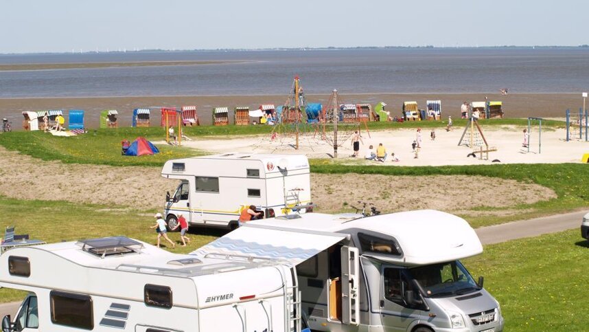 Camping Burhave actually comprises three campsites: one for seasonals, one for motorhomes and an area for tourers (where dogs are welcome) with a separate tent field. It is on the North Sea peninsula of Butjadingen, in close proximity to the Wadden Sea National Park. The 110 motorhome pitches are neither marked nor numbered, but all have 16A electricity, water and drainage, and most enjoy good views over the beach. The whole site is rather open and can become a suntrap in hot weather. There is an enclosed area with an artificial lake for safe swimming, where beach chairs can be hired.
