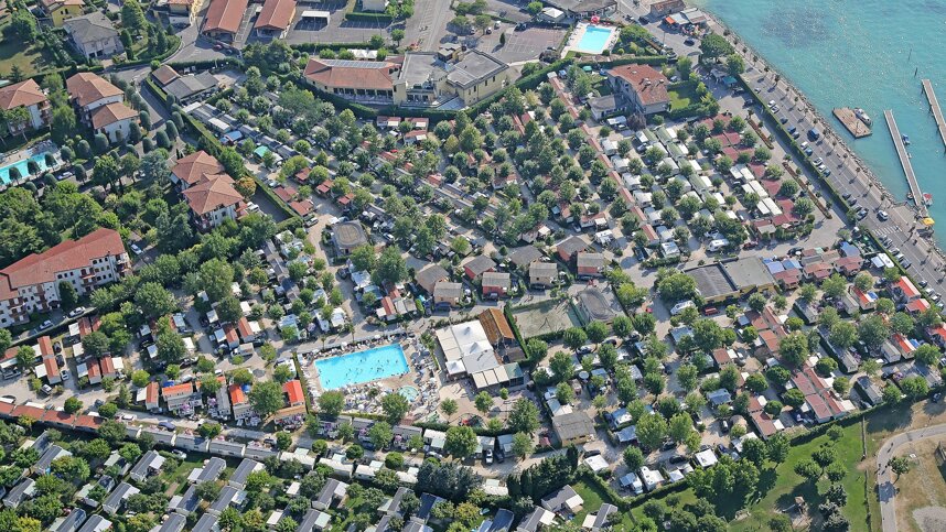 Site is on south side of Lake Garda in the town of Peschiera. From A4 take Peschiera exit and immediately pick up signs for site as you cross the attractive waterways on the 249. Take care as the signs are not that obvious.