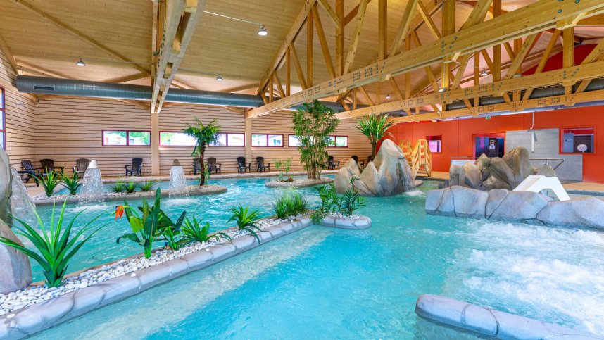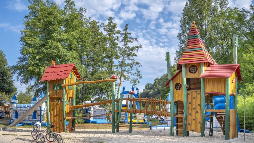 Three toilet blocks include accessible facilities . Shop (1/6-5/9). Bar (1/6-31/8). Snack bar (1/7-31/8). Swimming pool with water slides, jacuzzi and paddling pool (1/6-31/8). Play area. Trampolines. Minigolf. Archery. Bicycle hire. Sports pitch. Fishing (permit needed). Boat and pedalo hire. Games room. TV room. Children’s club in peak season. Entertainment and excursion programme (July/Aug). Mobile homes and chalets to rent. Gas and charcoal barbecues allowed. WiFi (charged).