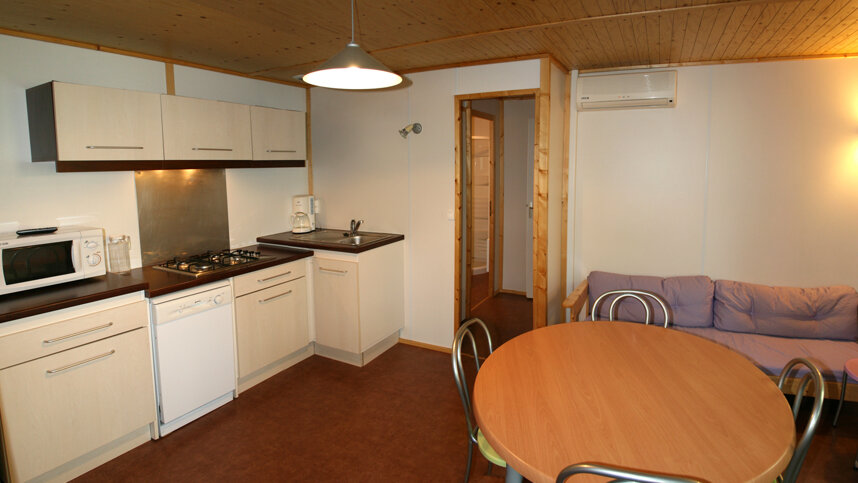 The toilet block is up to date and clean with preset showers and a few en-suite shower, toilet and basin cabins. Baby room. Accessible sanitary facilities. Laundry room. Bar, restaurant and pizzeria providing good food (weekends only in low season). Swimming pool (1/5-18/9). Play area. Covered area for pétanque. Games room. Activities arranged. Good air conditioned chalets, mobile homes and Romany type caravans for rent. Gas barbecues only. WiFi on part of site (free).