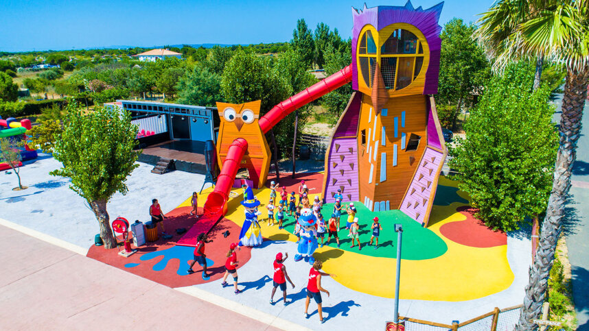 One toilet block, mainly for swimming pool users, has facilities for babies and accessible facilities. Laundry. Swimming pool complex with paddling pool, slides and indoor pool (heated May and Sept). Covered terrace with bar and restaurant. Play area with bouncy castle. Children’s club. Multisports court. Evening entertainment. No charcoal barbecues. WiFi (charged).