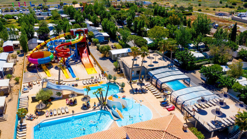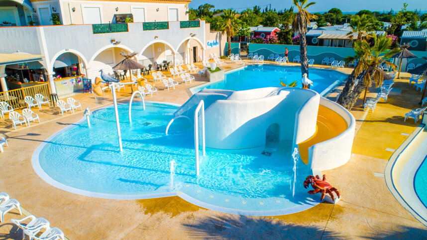 Camping Club l’Hermitage is a pleasant park with 100 mobile homes and chalets to rent, although a few are still privately owned. Most are attractively situated with trees and flowering shrubs, except for the newer ones (where cars are parked separately). The central pool and entertainment area forms the heart of the site and has a covered heated pool for early and late season, along with three other pools equipped with slides and a Jacuzzi to keep the whole family entertained. The bar with upstairs terrace and restaurant over looks the area. It is situated in a quiet position close to the vineyards, just outside the village of Sérignan and about 1.5 km. from the coastal resort of Valras-Plage with its usual seaside attractions.