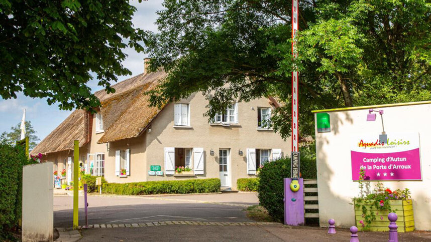 Camping D'Autun is a quiet country site in the heart of the Burgundy region, on the banks of a river just outside the town of Arroux. The 77-level, grassy touring pitches have electricity (10A, Europlug) and water nearby. High hedges and trees separate the pitches. To one side of the central thatched building houses the reception and bar. With more pitches to the other side in a more open area. In addition, there are nine mobile homes to rent. There is direct access to the river, and cycle routes are nearby. A big attraction here is the historic structures surviving from the Gallo-Roman period.