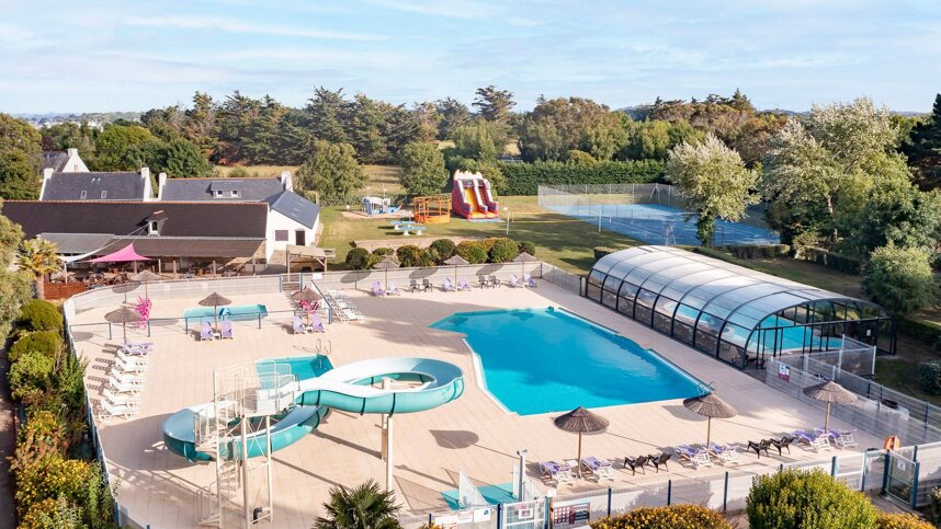 Camping de Bordeneo is ideally located in Belle Ile en Mer, in a beautiful wooded park just 600 metres from the beach. The campsite has various services, an aquatic area and entertainment in summer, but also throughout the season, an indoor heated swimming pool with massage jets, a gym, a multisport field and a large playground. 104 touring pitches are offered in various locations on the site. They also have 97 attractive, fully equipped mobile homes to hire.