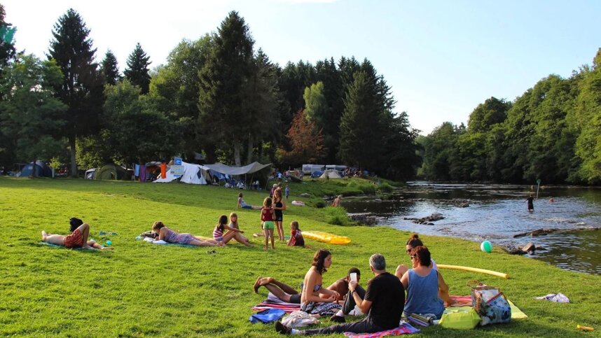 Canoeing is very popular and the site owners rent out canoes and will undertake to collect canoeists from points along the river. Children will enjoy the mini-farm with donkeys, goats and Vietnamese pot-bellied pigs. Accommodation to rent on site includes three yurts, two teepees, two large Sahara tents, a Moroccan tent, a Romany-style caravan and a double-decker bus. There are three sanitary blocks, one of which is new and adjoins the reception/bar area. A pleasant terrace by the bar overlooks the site. The villages of Sainte Cécile and Chassepierre are both within walking distance. Chassepierre has drawn many artists over the years, thanks to its Baroque church and attractive setting.