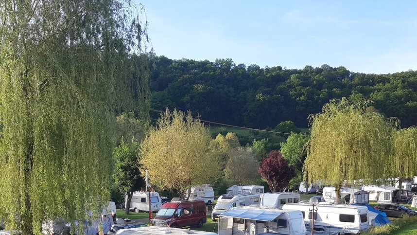Camping de la Sûre is on the banks of the river that separates Luxembourg and Germany. It is a pleasant, recently modernised site, close to Reisdorf with 120 numbered pitches (all with 10A Europlug). These are not separated but are marked with lovely beech and willow trees that provide some shade. Some of the riverside pitches can quickly become crowded in high season. The site is surrounded by trees on the hillsides and from Reisdorf visits can be made to Vianden Castle or Trier (oldest German city) just across the border. Safari tents and mobile homes are available to rent. The attractive bar/restaurant has an appealing terrace and shows major sporting events on a large screen.