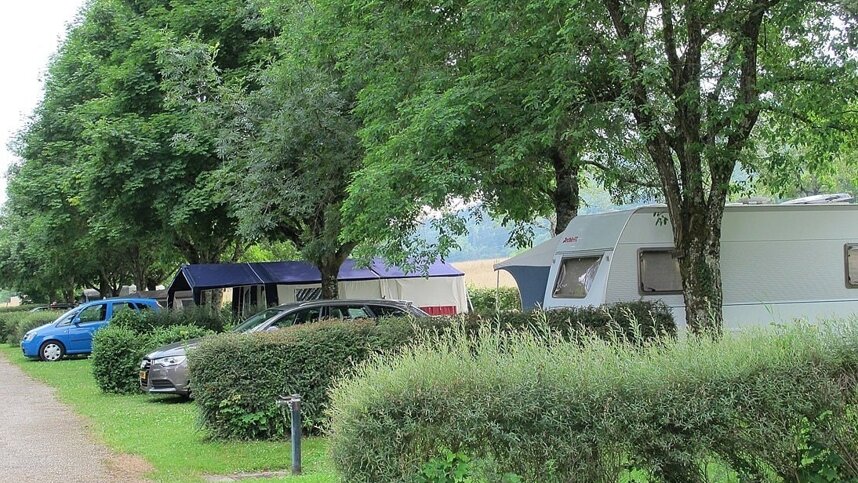 This small, attractive rural site is situated in a valley close to the Gorges de l’Ain and within walking distance of the lake facilities. The 110 medium sized, slightly sloping, grassy pitches (many with views of the surrounding wooded hills) are separated by low hedges and most have some shade. All have access to water points and electricity (5/10A) although some may need extremely long leads. A lakeside beach is just 300 m. away on the delightful Ile de Chambod (charged for in high season) and is an idyllic spot for picnics, beach bathing, paddling, boat launching, simple watersports and minigolf.