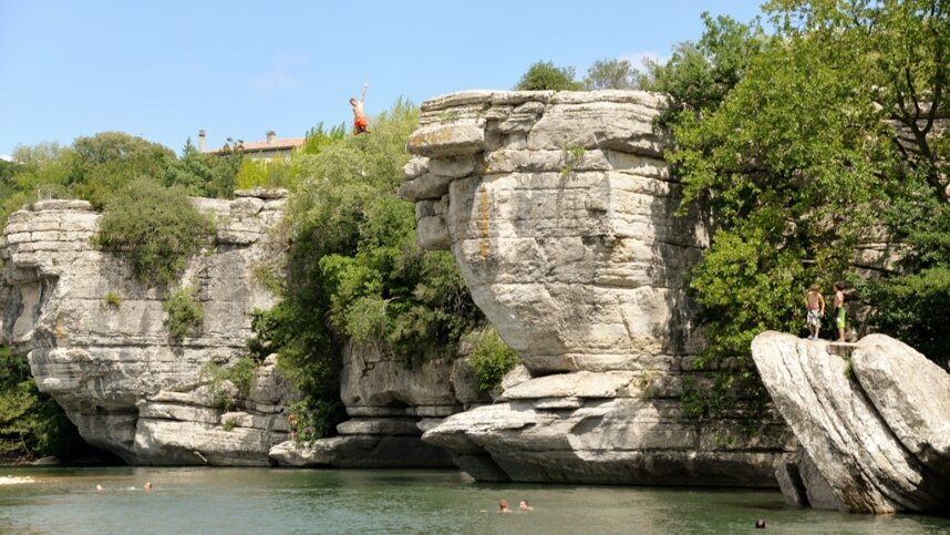Labeaume is located to the west of Ruoms. From Vallon Pont d’Arc take the northbound D579 to Ruoms and then join the westbound D245. the site is well signed from here.