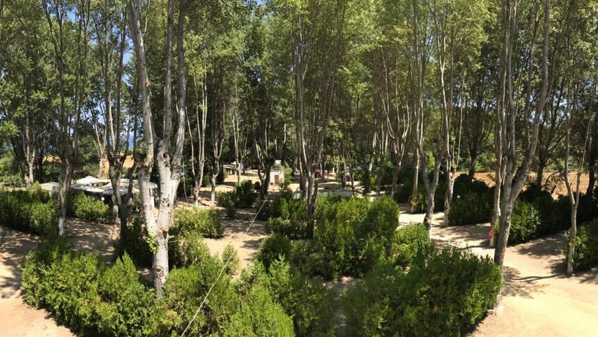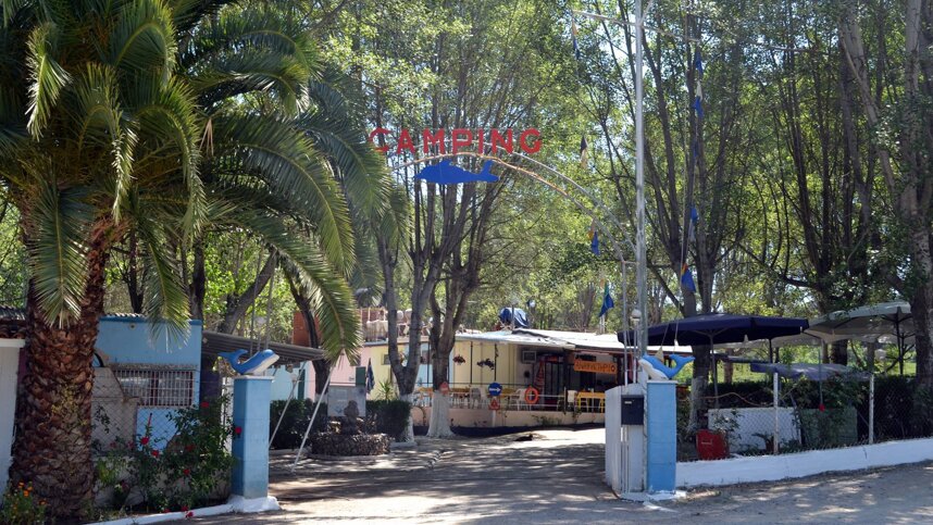 Camping Delphini offers a very simple, quiet campsite surrounded by fields in a rural area, set back a few hundred metres from the nearest beach. This is a place to visit if you are looking for a restful break and are not seeking all the facilities of the bigger beach-front sites. There are 75 pitches which are all for touring units, in a wooded area. The dense trees provide ample shade, so there are none of the horizontal screens found on many other Greek campsites. The restaurant and bar provide simple Greek meals and a place to chat with the locals in the cool shade of the terrace or under a parasol.