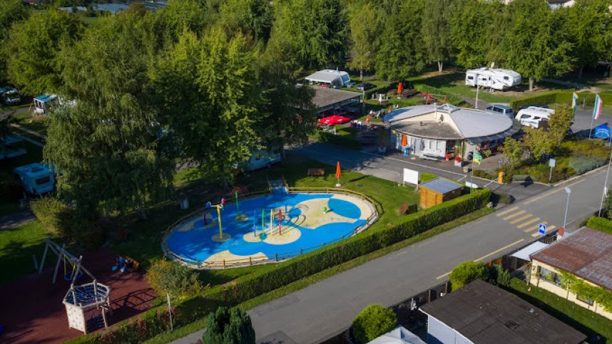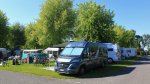 This relatively recently constructed touring campsite is on the side of Lake Biel and the river Thielle, close to the old town of Le Landeron. The site is divided into two sections: on the lake side of the road are residential seasonal caravans, and on the other is the modern campsite for tourists. The 160 touring pitches are all on level grass, numbered but not separated; a few have shade, all have 13A electricity and many conveniently placed water points.