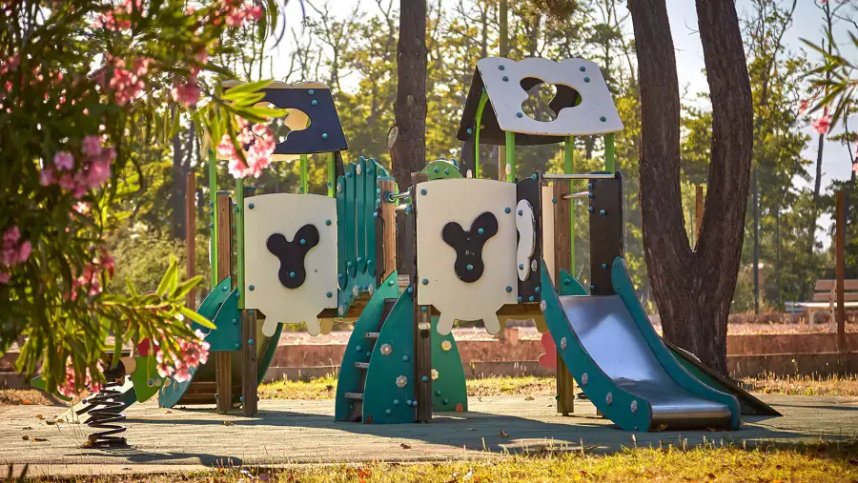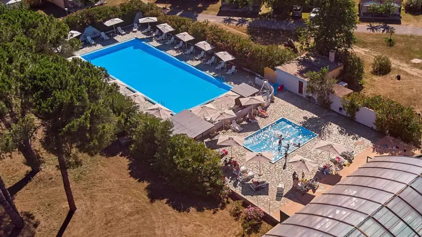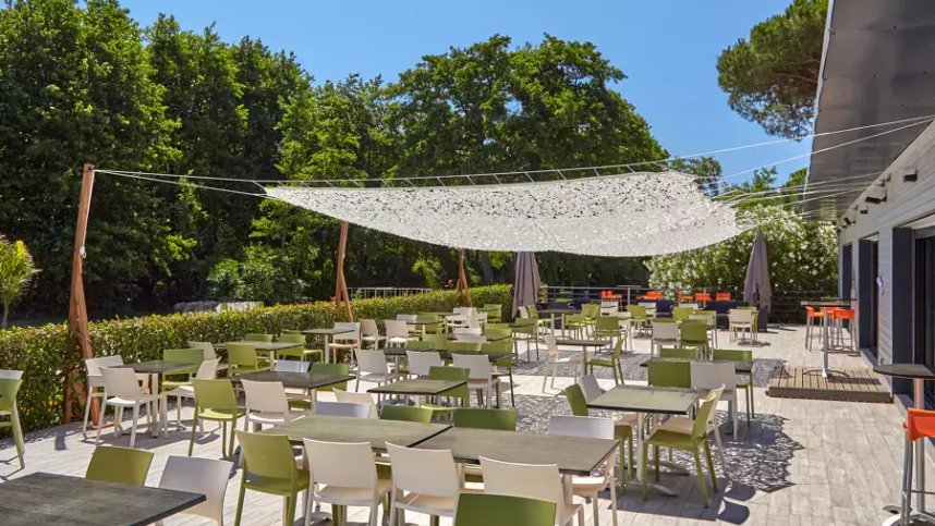 Self-service beach restaurant and bar. Pool bar. Swimming pool and paddling pool. Sauna. Tennis. Play area. Outdoor gym and sports area. On-site equestrian centre. Archery. Kids club. Minigolf. Squash. Entertainment in high season. WiFi (charged).