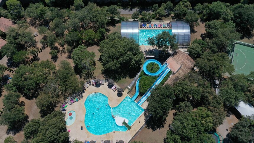 Amenities include an attractive pool area with water slides, heated indoor pool, new balnéotherapy pool and spa, a trim trail, mountain bike path and large grass play area including a trampoline. New in 2021 is Les Prés du Roi premium district, a quieter natural setting which has 300m2 pitches and a heated/air conditioned sanitary block. The camping area has direct access to the Voie Verte cycle route, giving you access to the pretty riverside town of Sommières, a 2km ride away - its historic centre, full of narrow streets lined with traditional shops is worth a visit. Nearby is the Roc de Massereau adventure park with 50 zip lines, canoeing and padlde boarding. This is a high quality site which is extremely good value for money, particularly in the low season.